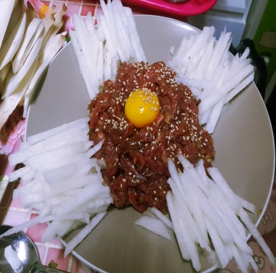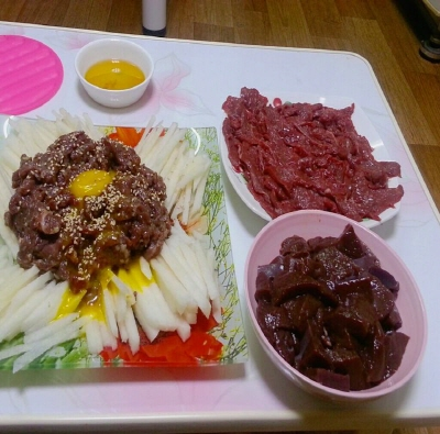 육회 육사시미 쌩간! 소주 없이는 못먹는 그들.. 저는 그래서 구충제 꼭 챙겨 먹어용...