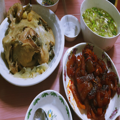 이거슨 술상입니당~ㅋ닭한마리 사다 압력솥에 푹 삶아서 국물도 안주삼아ㅋ백숙하면 가슴살은 키우는 강아지 뜯어서 줘도 되기 때문에 자주 해먹어요.셋이 같이 먹는 즐거움이랄까요 ㅋㅋ제가 껍딱이랑 닭발을 아주 환장합니다. 그래서 자주 해먹어용 ㅋㅋ