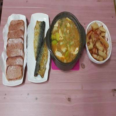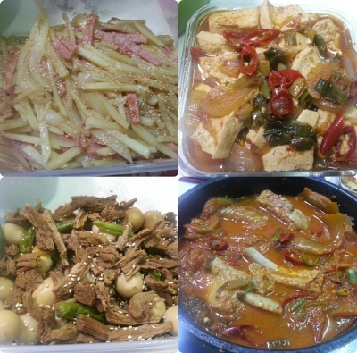 -감자햄볶음, 두부조림, 장조림, 등갈비찌개-.