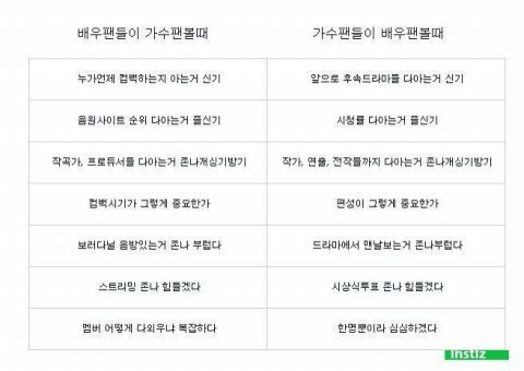 배우팬과 아이돌팬 차이