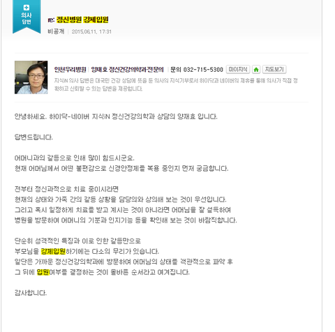 " 단순히 성격적인 특징과 이로인한 갈등만으로 강제 입원 하기에는 무리가 있습니다" 라네요.