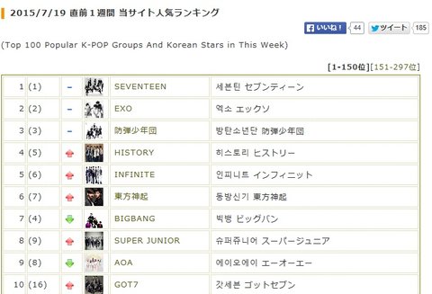 세븐틴이 약 3주째 일본 kpop사이트에서 그룹랭킹 1위를 차지하고 있습니다.