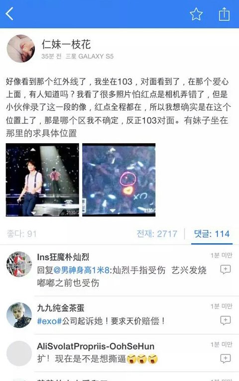 베이징콘 114구역 팬석에서 어떤 ㅁㅊㄴ이 종인이한테 레이저테러를 했대 이걸 맞은편 103구역 팬석에 어떤팬이 사진으로 찍어서 저 무개념 팬이 저지른 만행 올린건데 이거 보는순간 피꺼솟이다 종인이 눈동자에까지 레이저 쏘는데 와 저러다 눈이라도 다치거나 순간 시력 잃을수도 있는거자나 정말 미친거아냐? 가끔 스포츠경기 보면 저런 레이저테러하는 무개념들 보면서 한심하다 생각했는데 우리 종인이가 이런일을 당하다니 정말 맘같아선 저년 잡아다 두 눈깔에 24시간 레이저쏴주고싶다