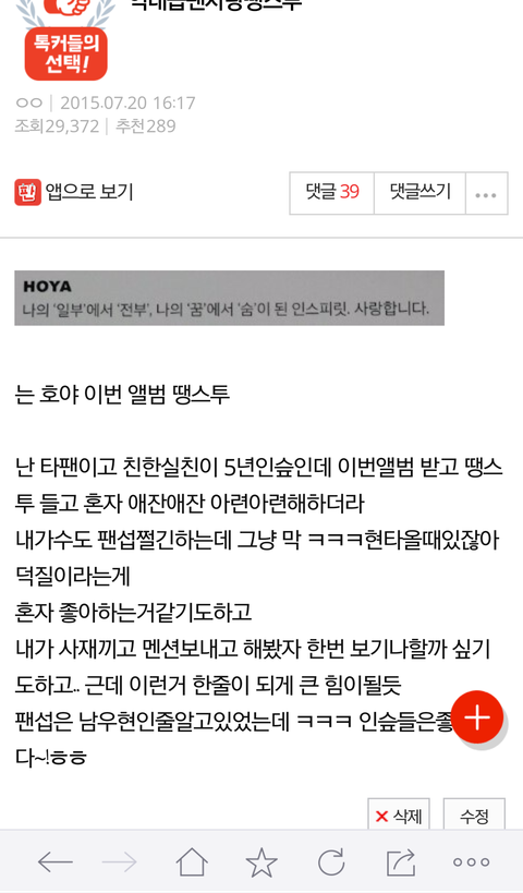 솔직히 내 말투에서 눈치깐슾들있을수도 있는데 ㅋㅋ 나 진짜 엔톡에서 욕먹을까봐.. 난진짜 감동받았는데 괜히 타팬이 인슾코슾한다는둥 니네 욕먹일까봐 최대한 덤덤하게 썻어