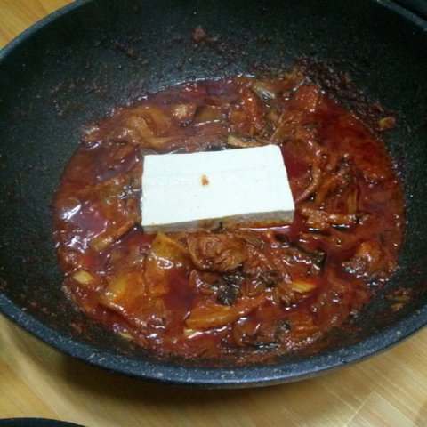 두부를 자르기 귀찮아서 그냥 통으로 넣어 버린 두부김치