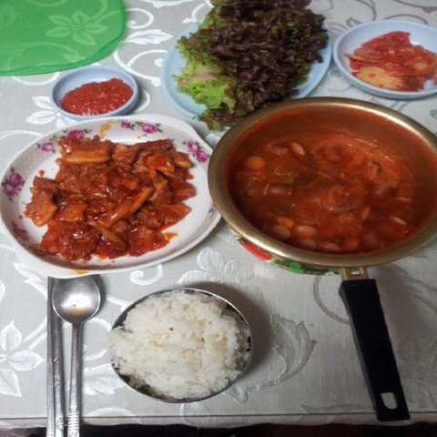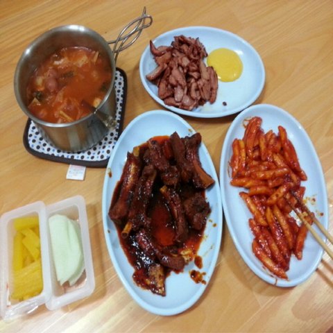친구들 와서 먹은 부대 찌개와 매운 등갈비 , 오리고기, 그리고 떡꼬치
