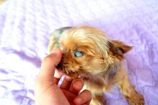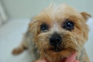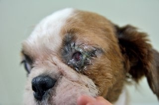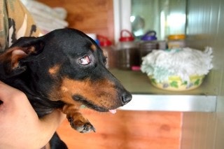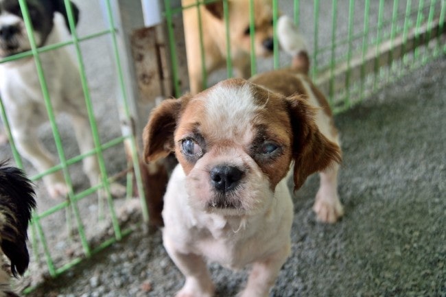 ↑ 번식장에서의 지저분한 환경과 그로 인한 악취로 눈에 이상이 생긴 아이.