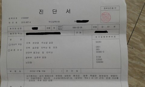 퇴원을 하며 입퇴원확인서를 받았습니다. 3군데의 염좌로 적혀있더군요.