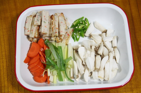 양념을 재울 동안 어묵, 새송이버섯, 당근, 대파 청양고추를 먹기 좋게 썰어주세요.