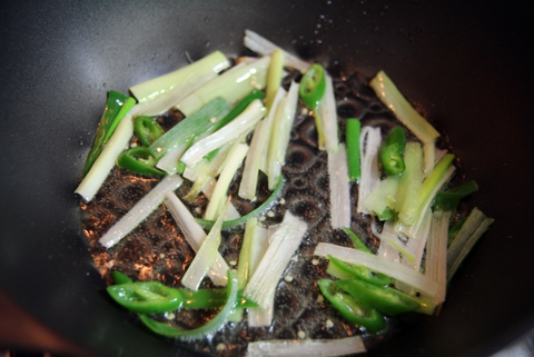 그 다음 달군 팬에 기름을 넉넉히 두르고 대파와 청양고추를 넣어 향을 냅니다.