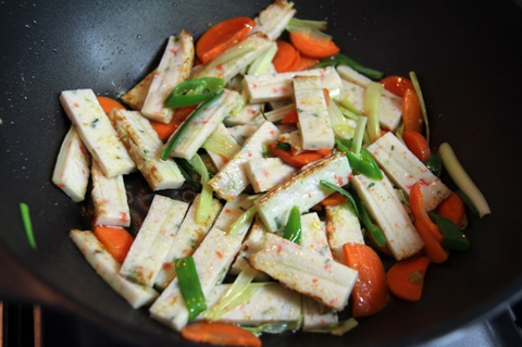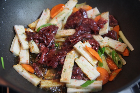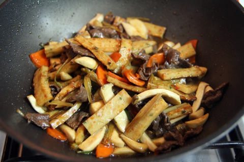 당근, 어묵 순으로 볶아주고 양념한 쇠고기와 양념장을 함께 넣고 볶아줍니다.