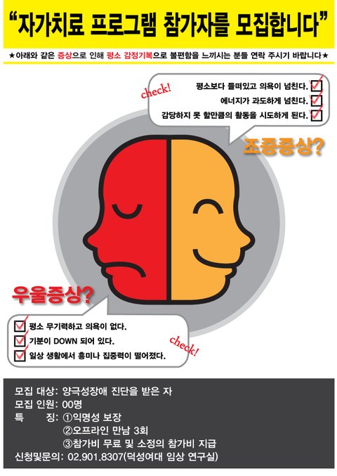 저희는 양극성장애 진단을 받으셨거나 평소 기분이 시시때때로 변하고, 정서 조절이 어려운 분, 우울한 상태와 에너지가 넘치는 상태가 반복되는 분을 대상으로 스스로 기분 조절을 하는 자가치료 프로그램을 시행 중입니다.