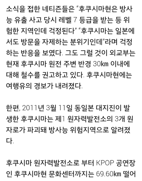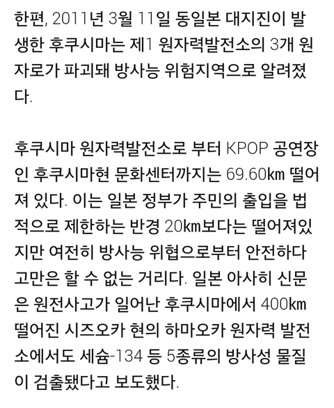 이 글을 쓰는건 다름 아니라 이번에 김옘과 에디킴이 후쿠시마로 공연을 가게 되었는데 사고 지점과 공여장 거이는 68km밖에 안되고 공연 프로그램중 출연가수들이 음식을 먹는 프로그램이 있습니다 아마 이 음식은 후쿠시마 재료로 만들어지겠죠