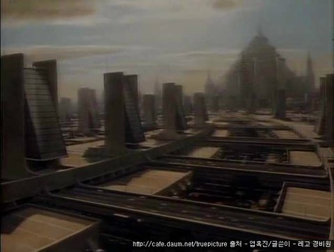 거미줄처럼 규칙적인 형태로 뻗은 도로들이 늘어선 미래의 도시.