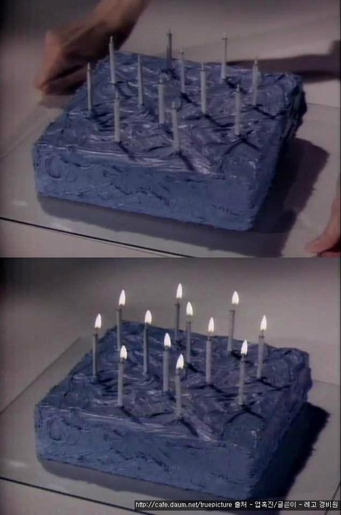아이의 생일을 축하하기 위한 파란 직육면체 케이크가 상 위에 오르자,