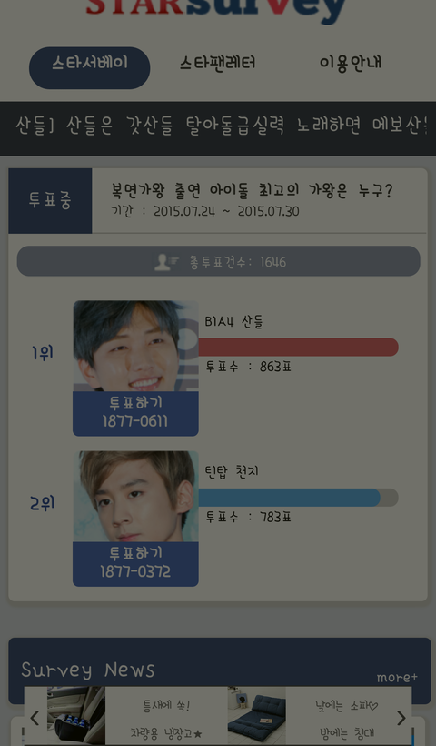 지금 ㅂㅁㄱㅇ 아이돌중 최고의가왕이라고투표하는곳에서 산들이 결승전에 올랐으니까 투표하자 상대가수랑 차이도별로안나고 투표기간도6일이나 남아서 언제뒤집혀질지모르니까 투표하자!!ㅂㅁㄱㅇ에서 산들이가 잘했으니까 1위하게 해주자!!링크니까 실시간으로 투표수 봐!!