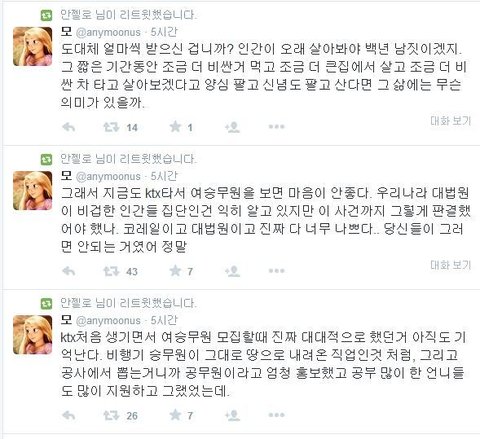 “코레일이 1년 뒤 정규직화 그리고 항공사 스튜어디스보다 나은 대우와 공무원 수준 대우를 약속해 항공사 승무원에 지원 중이거나 합격했던 승무원 지원자들이 KTX를 선택했다”