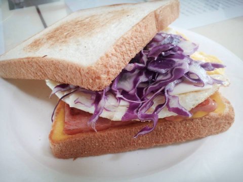 토스트기는 없어서 팬에 식빵굽고~ 햄, 계란, 치즈, 양배추 넣고 만든 토스트입니다! 한 끼 식사로 좋아요:)