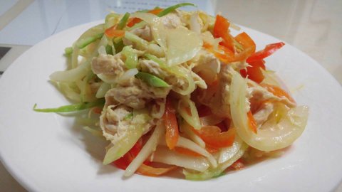 파프리카와 오이 양파 잘게 채썰고 닭가슴살 삶아서 찢은 후에