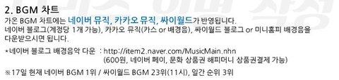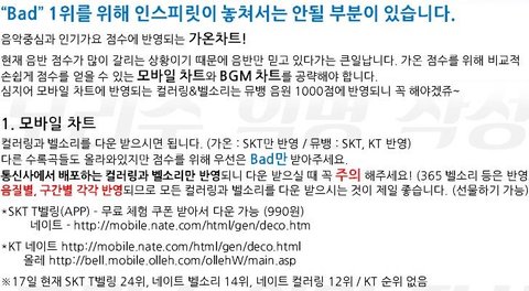 ※인가는 유툽 외에 가온 디지털 차트, 특히 BGM 차트 공략하자. 다운 받는 법은 아래 짤에. 그리고 멜론 아뒤 여러개 파서 Bad 다운 받자 (한 아뒤당 하나씩). 다운도 디지털 차트 반영. 받고 꼭 다른 폴더로 옮기던지 지우고