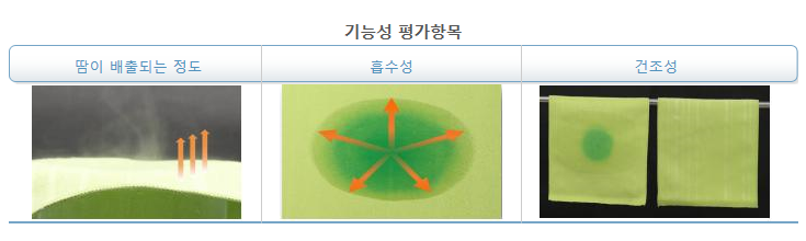 기능성 평가는 땀이 배출되는 정도와 땀의 흡수성 그리고 건조성을 평가하였다고 합니다.