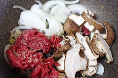 양파, 소고기, 표고버섯을 넣고 볶아주세요!