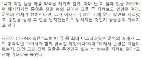오늘 밤 극 중 최대 미스터리였던 준영의 실체가 그의 충격적인 과거사와 함께 밝혀질 예정이다"
