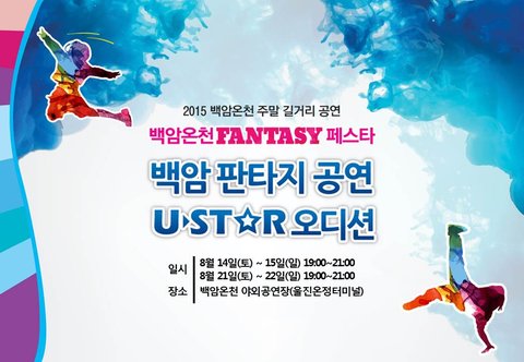이번 백암온천FANTASY페스타에서는 U ST☆R 오디션 참가자를 모집합니다.노래에 자신있으신분들~! 노디션 (가요가능해요~)모창에 자신있으신분들~! 모디션 (모창 메들리 가능)댄스에 자신있으신분들~! 댄디션 (장르무관. 단! 2인이상 그룹만 가능)