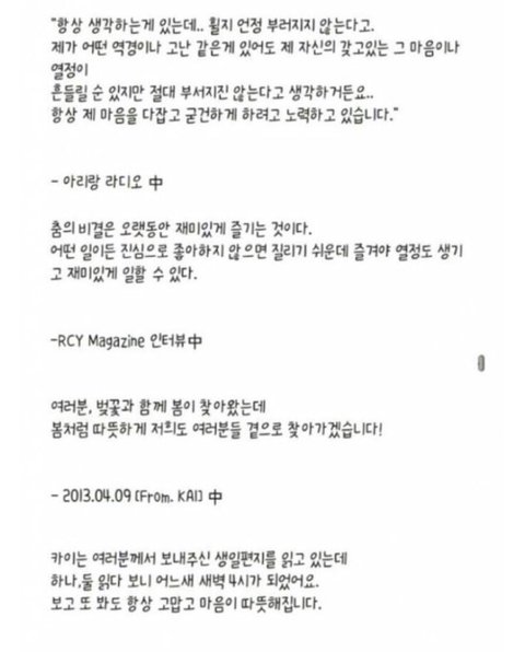 카이가 무작정 무신경하고 무뚝뚝하다는 편견에서 벗어나서 지금은 팬들한테 표현도 잘하고