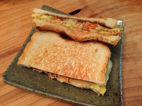 계란물에 야채 채썰어서 섞어준 다음에 부침개처럼 부쳐서 빵 사이에 끼워 먹으면 됩니다.