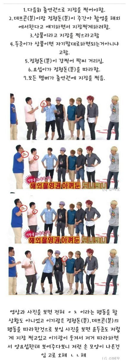 먼저 비스트가 스피드퀴즈를 해서 상품으로 재출연권을 준다고 지장찍으라고 함 저기 데프콘 제스쳐 보임?