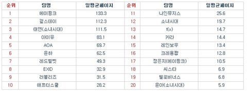 2015년 7월 걸그룹&여솔로&여아이돌 리젠탑20