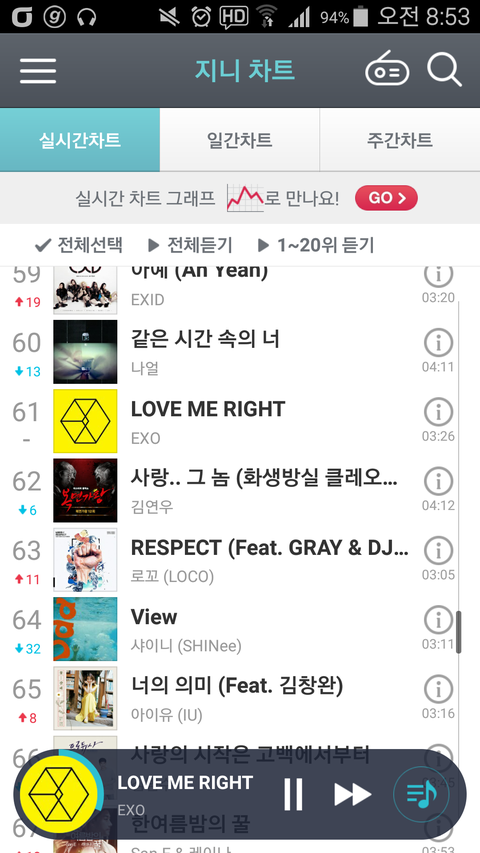 스밍좀하자... 나는 지니로 돌리는데 60몇등에 다른곡들은 100등안에도 못 들어... 제발 열심히 하자 저쪽애들은 벌써 포기했다 치고 우리라도 열심히 해야지 지금 찬열이 세훈이 어쩌구 하면서 싸울 게 아니라니까?