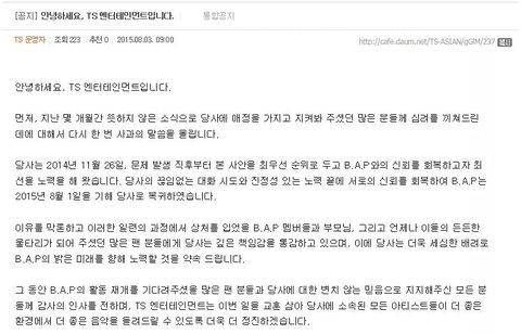 흔한 그냥 밥돌이들 팬으로써 항상 다른 연예인들 판에 글올라올때 마다 승소하자 승소하자 했는데 오늘 페이스북 보니깐 이게 뭐람ㅋㅋㅋㅋㅋㅋㅋㅋㅋㅋㅋㅋ와 다시 생각하고 한번더 생각하고 또 생각해도 화나네 뭐 잘 모르는 팬들이 봤을때면 뭐야 일단 잘해결된거니깐 좋아해야되는거 아냐? 라고 생각하겠지 나도 이제 음악방송이나 예능에서 다시 봐서 좋지 완전 좋고 진짜 너무 좋은데 왜 하필 TS냔 말이지 진짜 많은 대화와 타협?ㅋㅋㅋㅋㅋ어느쪽이 대화를 시도했는지는 모르겠지만 증거내라할때도 않내고 지들가수 컴백시키고 활동시키느라 바쁘신 TS인데 왜 진짜 왜 다시 TS야???? 아 진짜 화난다 좋게 생각하려 해도 좋게 생각할수 없다 에휴 진짜 뭐냐 데뷔팬으로써 B.A.P가 얼마나 쉴틈없이 활동했고 악덕같은 소속사 떄문에 살인적인 스케줄하느라 힘들어하고 대현이는 너무 힘들어서 링겔도 맞았는데 그와중에 또 소속사가 잡아논 스케줄 해야되서 밴드붙이고 올라고 그랬는데 이젠 안그럴지 모르지만 또 그런 상황이 반복될까 걱정스럽고 화도나네 에휴...글 읽어주셔서 감사합니다. 그냥 어처구니없는 소식에 화난 베이비라고 생각해주세요...