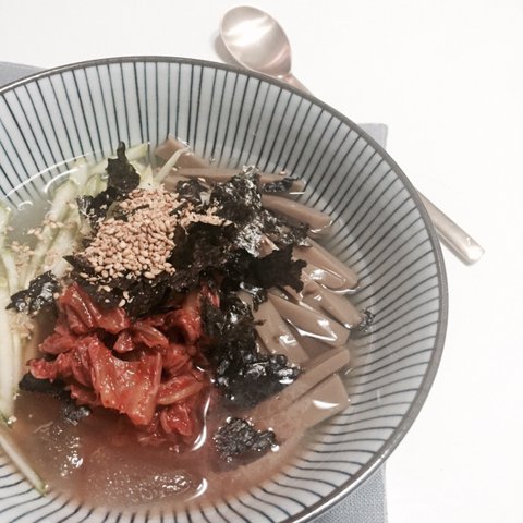 시판 냉면육수에 신김치, 묵, 오이 썰어넣고 참기름 한방울 똑!