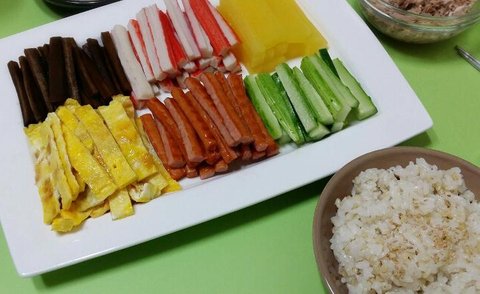 밥에 김밥 밑간 해주고, 김밥 말아서 와사비간장에 콕 찍어먹으면 맛있어요.