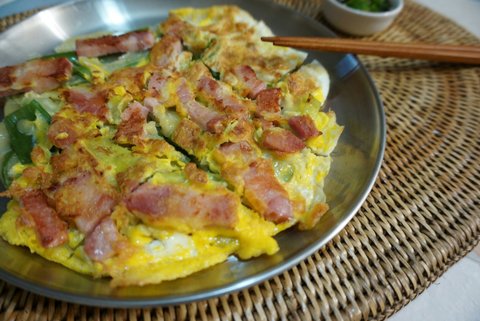 대파는 기름에 한번 지진후 삼겹살(시판베이컨도 가능), 계란물 부어 부쳐줬어요