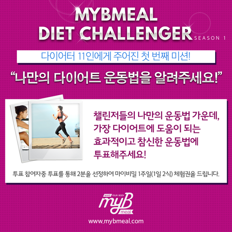 지금부터 올라오게될 11명의 운동법 중 가장 효과적일 것 같은 운동법에 "추천"을 눌러주시면 추첨을 통해 마이비밀 1주일 체험권을 드립니다. 많은 참여 부탁드릴게요!!