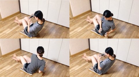 바닥에 앉아 무릎을 구부리고 상체를 뒤로 45도 정도 기울여줍니다.