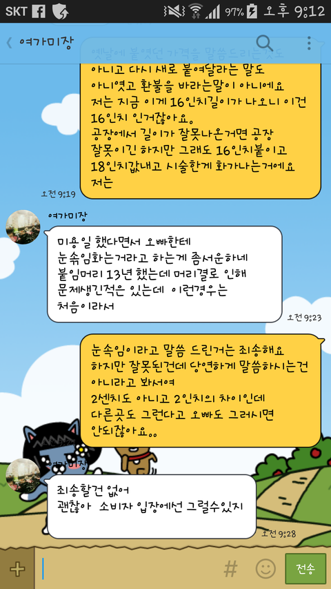 그래서 회사마다 길이가 달라도 2인치가 차이가 나는데 이건 그냥 눈속임으로 16인치를 18인치라고 속이고 붙여준거잖아요 가격도 10만원이나 차이가 나는데 화가나서 카톡으러 계속 따지는데 말도안되는 소리로 넘어가려하고 다른말하고 다른가게도 그런다고 그게 당연하다는식으로 넘어가려하고 너무 어이가없더라고여 이럴때 어떻게 해야하는지 잘모르겠어요 진짜 어이가없고 말이 안통해서 답장을 아직도 안하고있는데 어떻게 해야하나요?