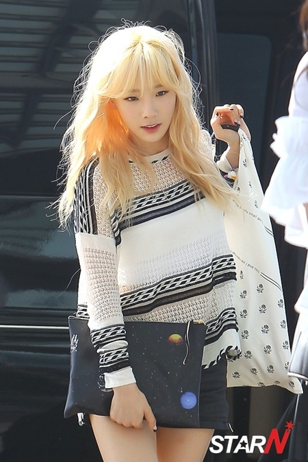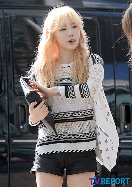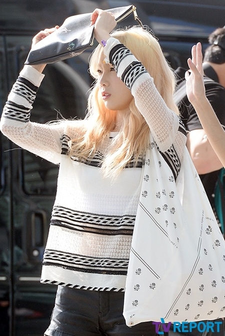 화려한 금발 머리에 블랙앤화이트 패션을 하고 나타난