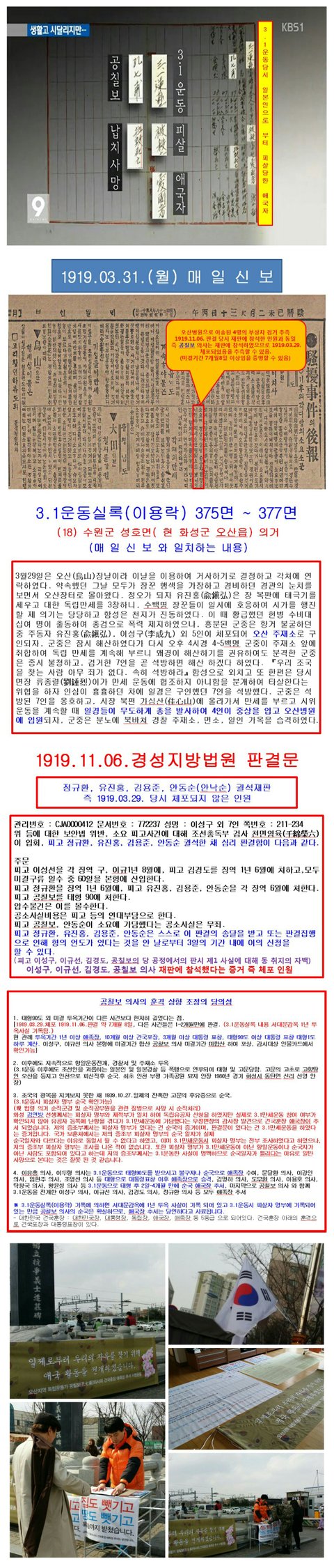 하지만 국가보훈처에서는 족보에 나와 있는 순국일자와 3.1운동 당시 피살자명부에 나와 있는 순국일자가 다르다는 이유로 경성지방법원 판결문에 옥고기간이 기록되어 있지 않다라는 이유로 대한민국 건국훈장 애국장 추서를 하지 않고 있습니다. 국가기록원에 있는 판결문 피살자명부 국사편찬위원회 3.1운동 실록 매일신보등 공적 자료를 통해 충분히 저의 증조부의 투옥기간 및 순국사실을 확인할 수 있습니다. 저의 증조부께서 옥고를 치루신것과 순국한것이 확실한데 왜? 국가보훈처는 훈장을 추서하지 않는지 모르겠습니다.