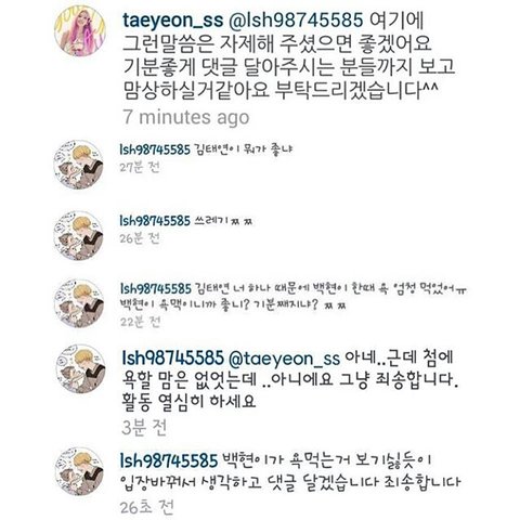 한 엑소팬이 변백현 언급하면서 태연 인스타에 악플을 남기자 태연이 태그해서 다른사람까지 맘상할까봐 자제해달라 부탁함. 그니까 바로 꼬리내리는 엑소팬ㅋㅋㅋㅋㅋ 태연도 고소 한다 선언한 후 그냥 당하고있지많은 않은듯. 적극적으로 대처 잘하는거 같음 근데 엑소팬 망신좀 작작 시키삼.. 태연도 인스타 악플 대부분이 엑소팬인거 사람이라면 당연히 알테고 변백현 이름 들먹이면서 태연 욕하는 수준ㄷㄷ