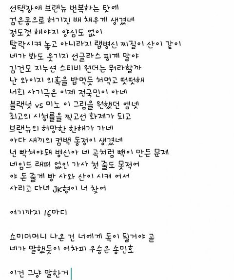 어제 미노는 편집된 거 없이 16마디 정확히 다 했고 이게 어제 가사야