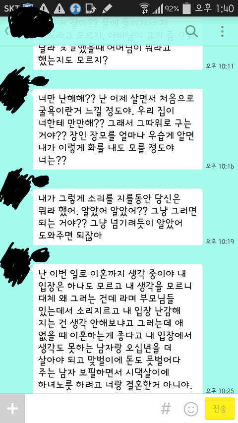 그럼 제가 아내 처가댁에 가서 아내랑 같은 취급 받으면 기분 좋을 거 같냐 어머니가 하신 것만틈 나도 찬밥 먹고 거기가서 부려 먹고 처가 살이 해야 공평한거 아니냐고 ㅠ