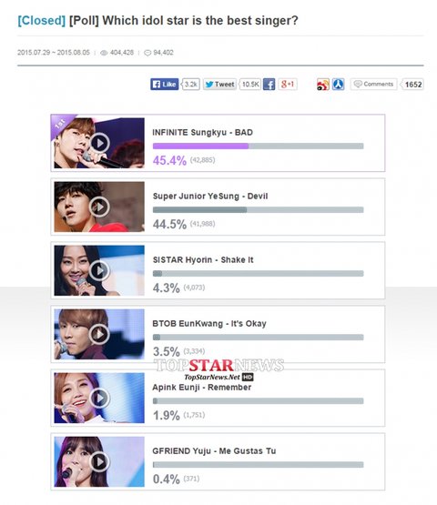 엠넷 MWAVE 폴에서 인피니트 성규가 베스트 싱어에 선정됐다. 지난 7월 29일에서 8월 5일까지 진행된 이폴은 영문으로 진행되었으며, 40만회 노출되고 94천개의 댓글이 달릴만큼 해외에서도 많은 참여가 있었다ㅋㅋㅋ 그러니까 아래도 하고가!!