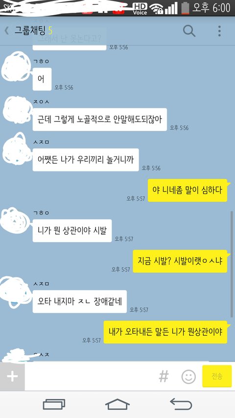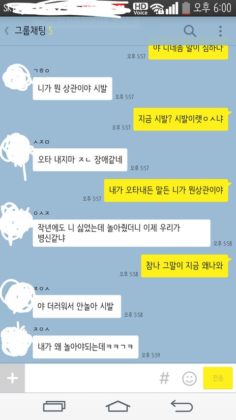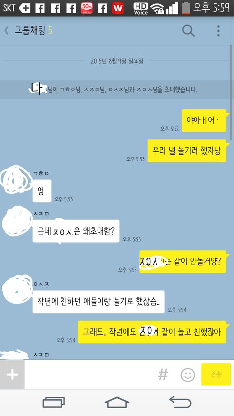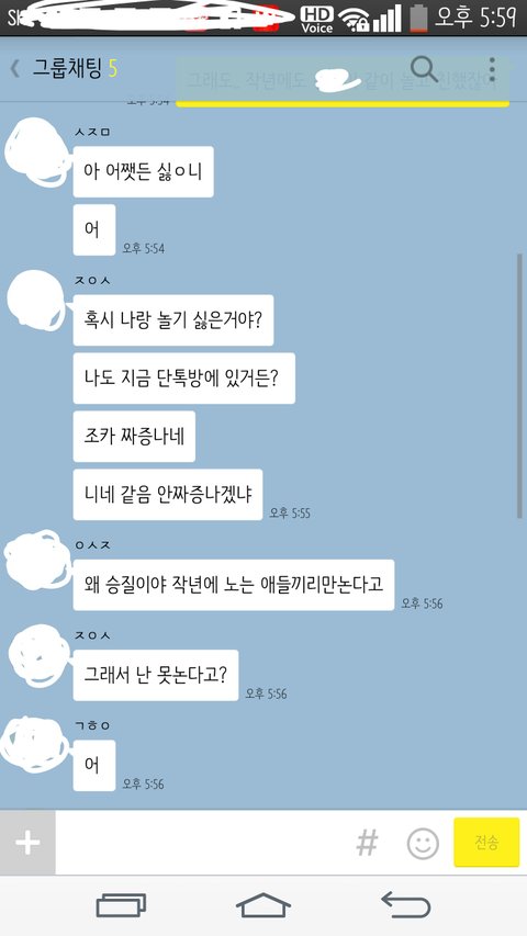 그런데 이번년도에 ㄱㅎㅇ 은 혼자 반이되고 ㅈㅇㅅ이랑나랑 같은반이구,ㅇㅅㅈ이랑 ㅅㅈㅁ이랑 같은됬거든 그래서 같은반인 애들끼리 친해지고 쟤네랑 좀 멀어졌단말이야.