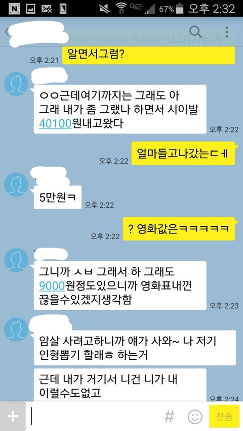 대충 상황정리하면 제친구가 여자애한테 데이트신청을 했는데 밥값도 다 자기가 내고 (40100원) 그리고 영화티켓도 자기가 내야했습니다 근데 점심때 그 년이 개비싼걸 시켰는지 돈도얼마안남았고요