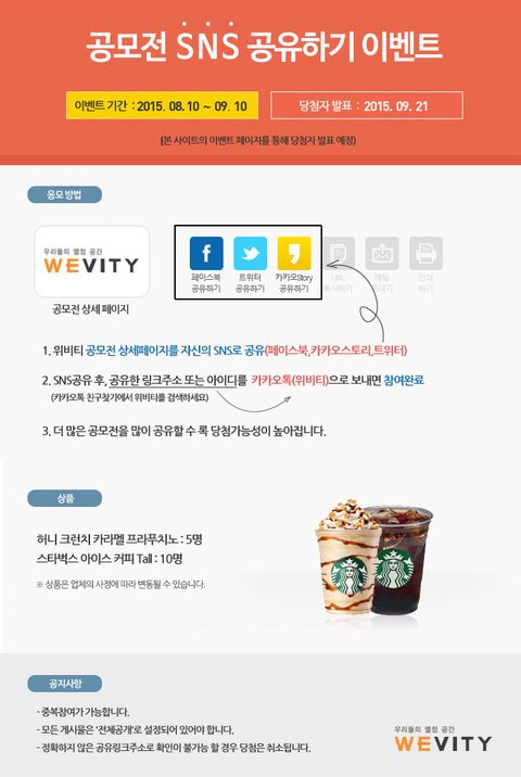 공모전 SNS 공유하기 이벤트 ■ 이벤트 기간 : 2015년 8월 10일 ~ 9월 10일 ■ 당첨자 발표 : 2015년 9월 21일 ■ 경품- 허니 크런치 카라멜 프라푸치노 : 5명- 스타벅스 아이스 커피 Tall : 10명