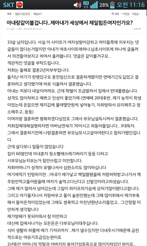 씨.발 미친 새끼. 병신 같은 게 처자식 거느리고 사는 가장 노릇도 제대로 못하면서, 마누라 지 부모한테 수모당하게 만들어서 대리효도 시키는 새끼. 대가리에 뇌가 비었냐, 씨.발놈아. 너새끼 포경수술하고 쉬는데, 장인어른이 마음 아프니까 내가 약 발라주마 바지 벗고 고추 내놔봐라, 하면 그게 엄청엄청 감사하기만 하겠다? 넌 뇌가 없으니까. 그치? 욕하고 나니까 후련하네요. 저도 직설적이라 그렇지, 뒤끝은 없어요. 이제 좋은 말로 좋게 말할 거니까, 위에서 욕 먹은 거 마음에 안 남고 괜찮죠? 아, 근데 아무리 생각해도 이 새끼 열 받네. 이 개만도 못한 씨.발놈아!! 어머, 저도 모르게 순간 또 욕이 나왔네요. 다시 좋은 말로 쓸께요. 그래도 넌 씨.발놈이야, 이 개.새끼야!! 다시 좋은 말로 해야징. 어때요? 사람 마음에 눈에 안 보이는 칼로 상처를 가득 내놓고는, 잘해주는데 그깟 칼로 찌른 게 뭐 대수라고 그걸 그렇게 가슴에 담아두냐고 하면, 칼 맞은 사람은 뭐라고 할까요? 지금 잘해주는 저 사람이 언제 또 나한테 칼을 휘두를지 모르는데, 그 잘해주는 게 그저 좋고 감사하기만 할까요? 님 그냥 아내하고 애기만이라도 친정에 보내시구요, 양육비나 대주세요. 그리고, 님 부모님은 님 혼자 모시고 살다가 그 재산 다 받아서 잘 먹고 잘 사세요. =================================================================== 씨.발새끼 실시간으로 욕 먹으니 머리가 띵하다느니 아내는 댓글 보고 운다느니 하더니, 글 삭제하고 튀었네.